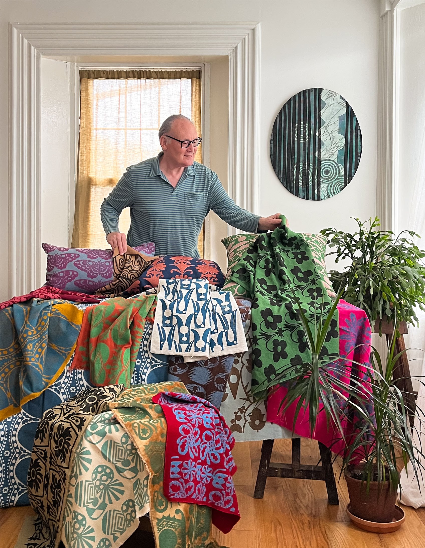 Moving to New York City after graduate school, he shifted focus from fine art painting to textile design, incorporating the pattern-making that was intrinsic to his artistic practice. Concurrently, his working life fed his love of history, beauty, art, and his keen eye for superb quality. For decades he worked with luminaries in the New York interior design industry including: Eve Ashcraft; Amy Perlin; John Rosselli; Martha Stewart; and Bunny Williams. His work ranged from color consulting for high-end clients to sourcing, selling and styling European antiques. All the while, he continued to create designs and develop a vision for his brand. In 2015, he returned to his New England roots and began producing custom textiles and pillows for a select clientele under the name Drusus Tabor.